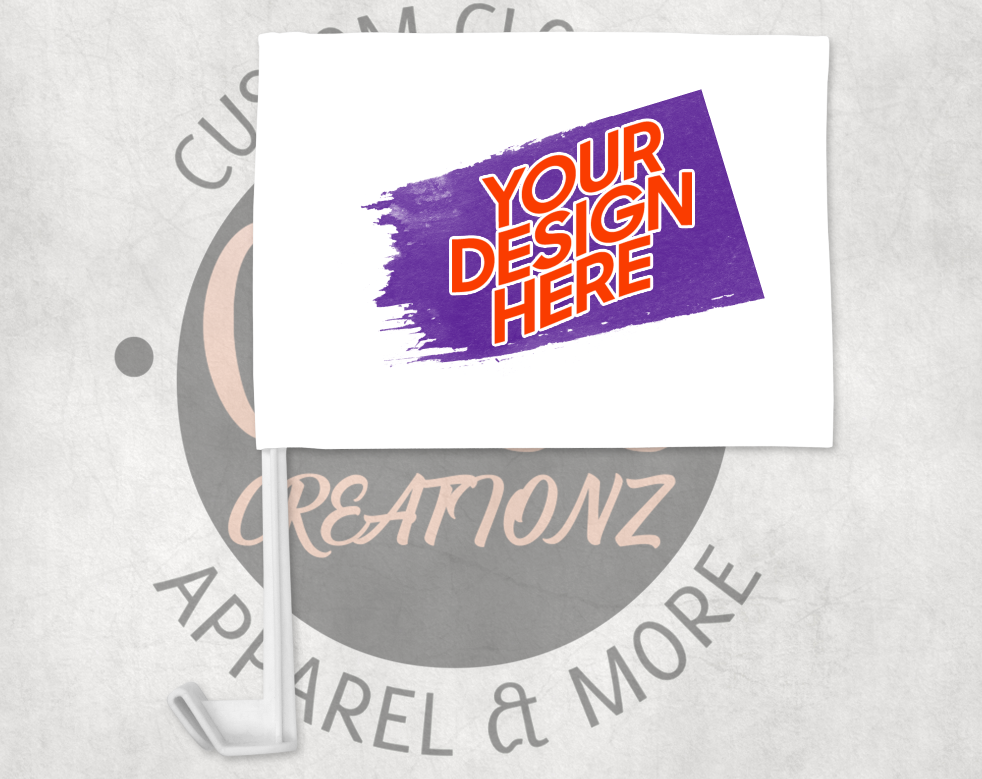 12x8 Heavy-Duty, Double Thickness Car Flags. Print on both sides. Each side is a separate layer, stitched together. Pole has a clip to hold in place.